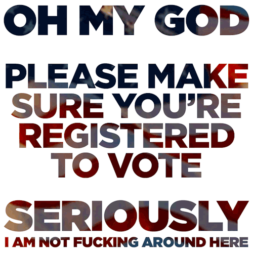 Many people have written and spoken eloquently about how much this election matters, and I know it’s very preaching-to-the-choir for me to do it here. I know also that everything you can say about it, no matter how true, sounds like hyperbole. Can you believe that people, people who are black and/or Latinx and/or trans and/or gay and/or disabled and/or female and/or poor and/or in any other non-dominant position are actually, like, going to live or die depending on the outcome of this election????? It’s true! And it’s exhausting to think about! Sometimes it feels like “oh god, whatever, give Drumpf the codes, bring on the bomb, let me just be dead.” I get that. I do. But this is a very, very easy way to check whether or not you can vote so you don’t get shut out of one of the most important decisions the U.S. will ever make! Don’t just yell about it on the internet. Be about it. Otherwise we’re all in for a mandatory screening of BREXIT II: THIS TIME ITS NUCLEAR and I honestly don’t want to exaggerate but many of us will be just fatally fucked.